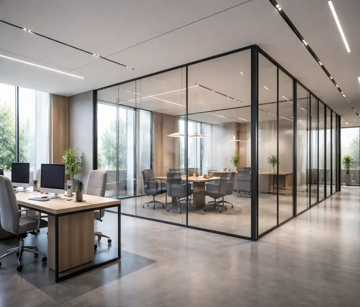 כאשר אין חדר ייעודי, ניתן ליצור “אי שקט” בתוך חלל פתוח: מחיצה מזכוכית שמגדירה אזור עבודה, שיחה או ריכוז. המחיצה מפחיתה הסחות דעת, שומרת על זרימת אור ואינה חוסמת תקשורת בסיסית עם הסביבה. זהו פתרון נקודתי וגמיש שמתאים לחללי עבודה משותפים, קליניקות גדולות או משרדים פתוחים – בלי עבודות כבדות ובלי שינוי תשתיות.